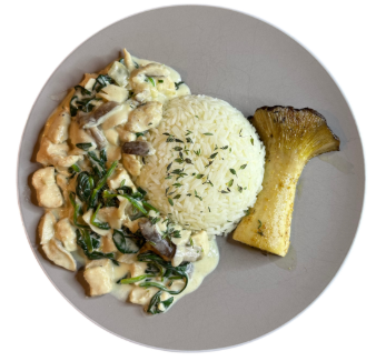 Geniet van een heerlijk romig kipgerecht met een luxe twist. Malse kipblokjes worden gecombineerd met exotische paddenstoelen en verse spinazie in een zachte roomsaus. De in de lengte gehalveerde koningsoesterzwammen worden apart gegrild en gekruid, waardoor ze een rijke, hartige smaak krijgen. Serveer met geurige jasmijn- of basmatirijst voor een perfect gebalanceerd gerecht. Ideaal voor een doordeweekse maaltijd of een feestelijk diner!