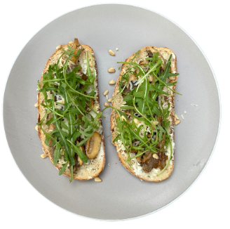 Een rijke, romige ragout van Lion’s Mane en beukenzwam. Geserveerd op knapperig Turks brood met een frisse laag rucola en een vleugje truffelolie. Perfect als luxe lunch of warm voorgerecht.