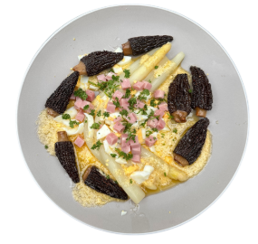 Vier de lente op z’n best met dit klassieke aspergegerecht, verrijkt met een vleugje luxe. Zachtgekookte witte asperges worden geserveerd met romige hollandaisesaus, fijngesneden ei, ham en gebakken morieljes – dé lentepaddenstoel bij uitstek. Perfect als feestelijk hoofdgerecht of een elegant seizoensbord. Simpel te maken, groots van smaak.
