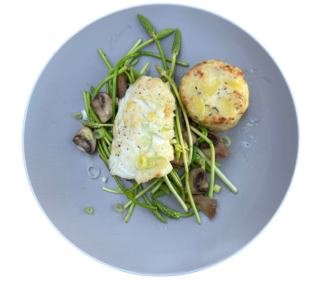 Kabeljauw met korenaarasperge en paddenstoelen