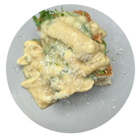 Een luxueuze pasta met een rijke saus van wilde paddenstoelen, verse spinazie en een vleugje truffelolie. Afgewerkt met Parmezaanse kaas en peterselie – een verfijnde traktatie voor elke pastaliefhebber!