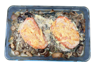 Zoete aardappel-paddenstoelovenschotel